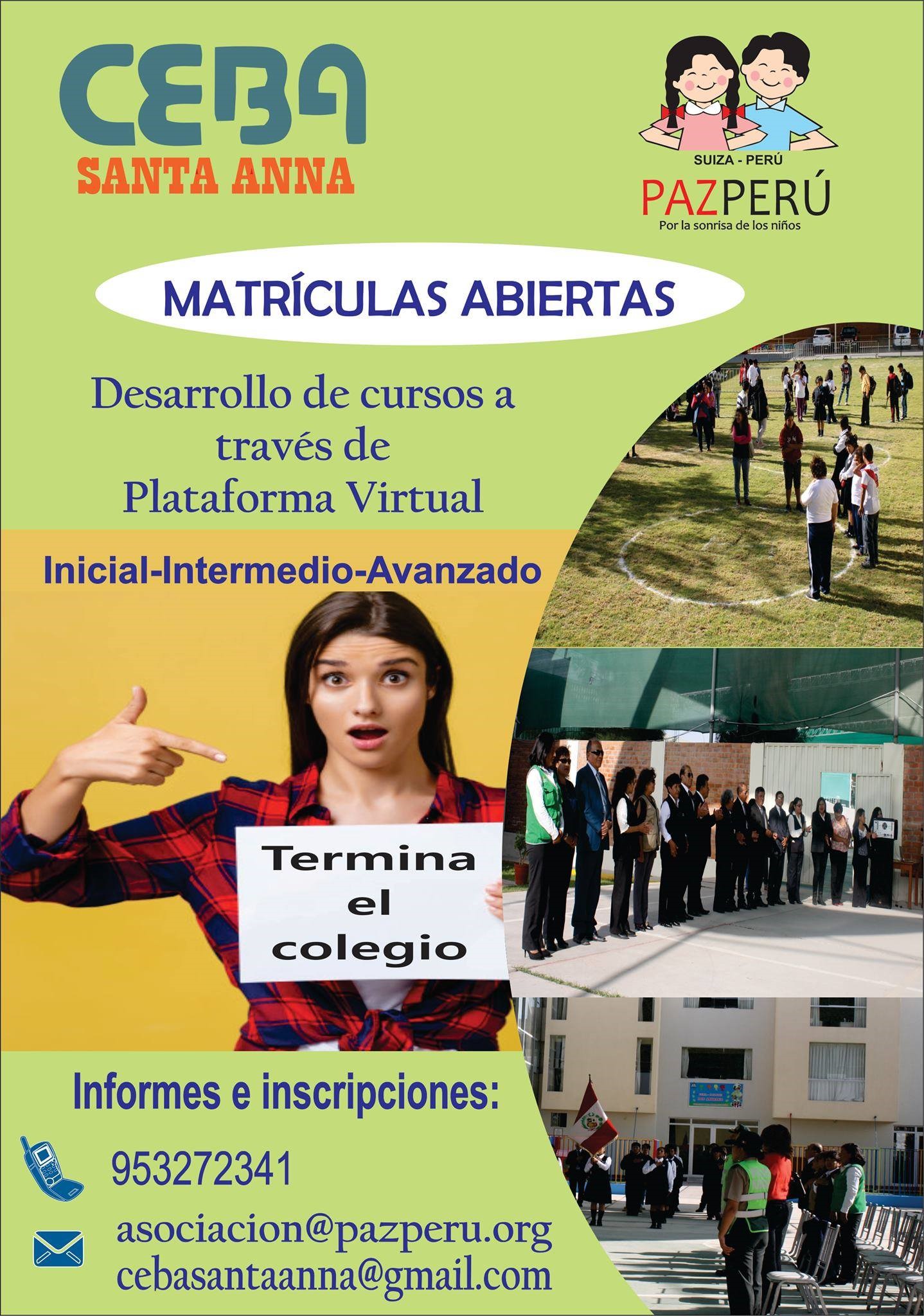Según el documento “Orientaciones para el Desarrollo del Año Escolar 2021 en Instituciones Educativas y Programas Educativos de la Educación Básica” y aprobado por la Resolución Viceministerial N° 273-2020-MINEDU, indica que el año escolar 2021 comenzará el 15 de marzo y culminará el 17 de diciembre. Asociación Paz Perú, pone a su disposición, nuestros servicios de Inicial de 3, 4 y 5 años; Primaria en los grados de 1°, 2°, 3° y 4°; CEBA Inicial, Intermedio y Avanzado; CETPRO con las carreras de Computación, Panadería y Pastelería, Cocina y Repostería, Cosmetología.